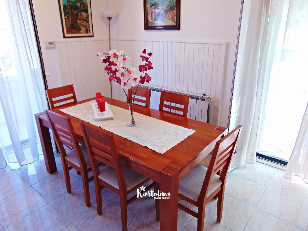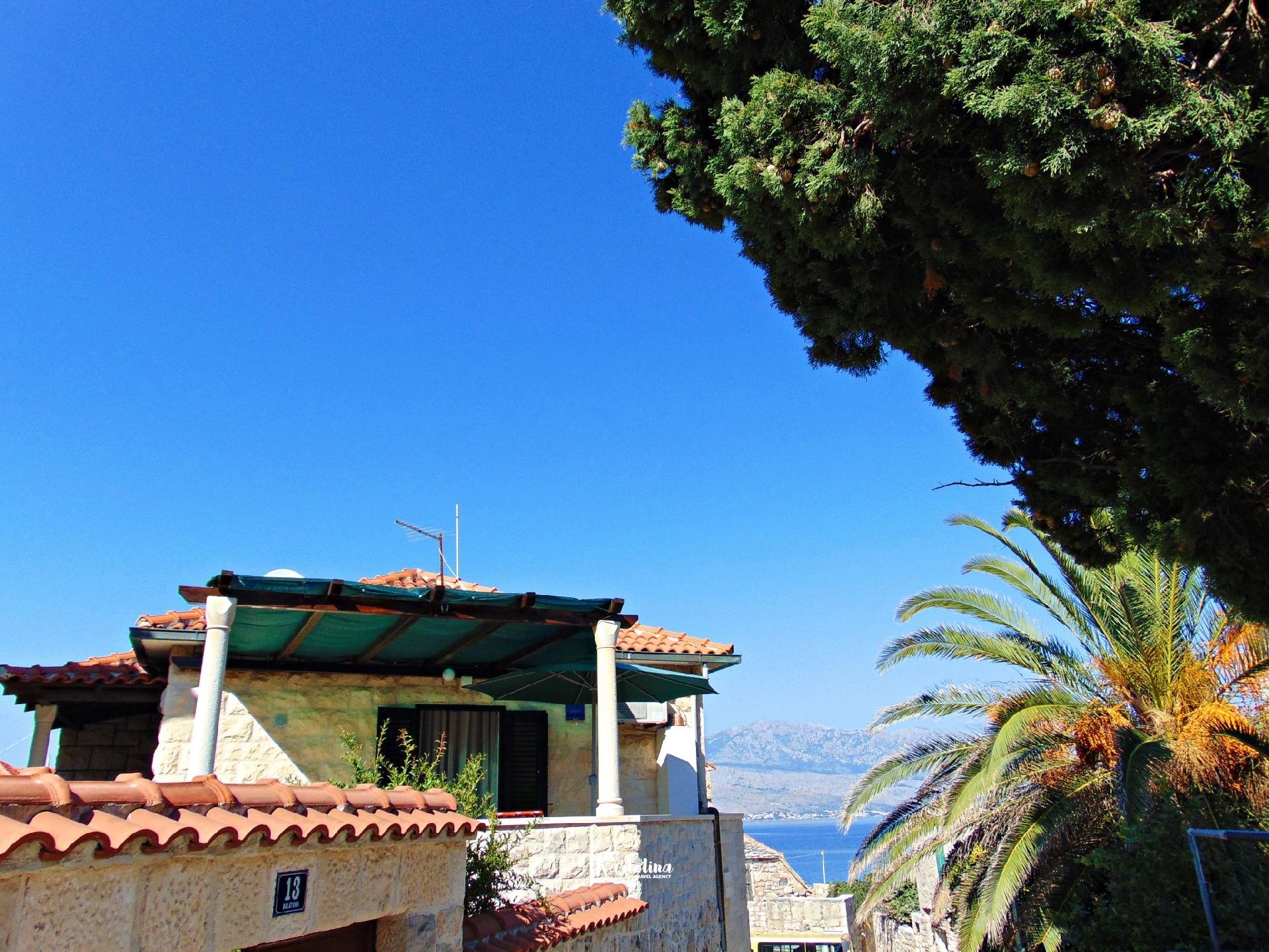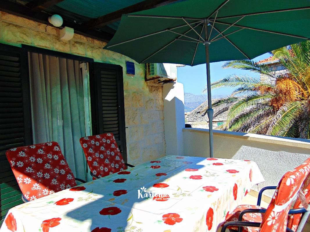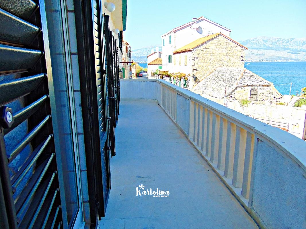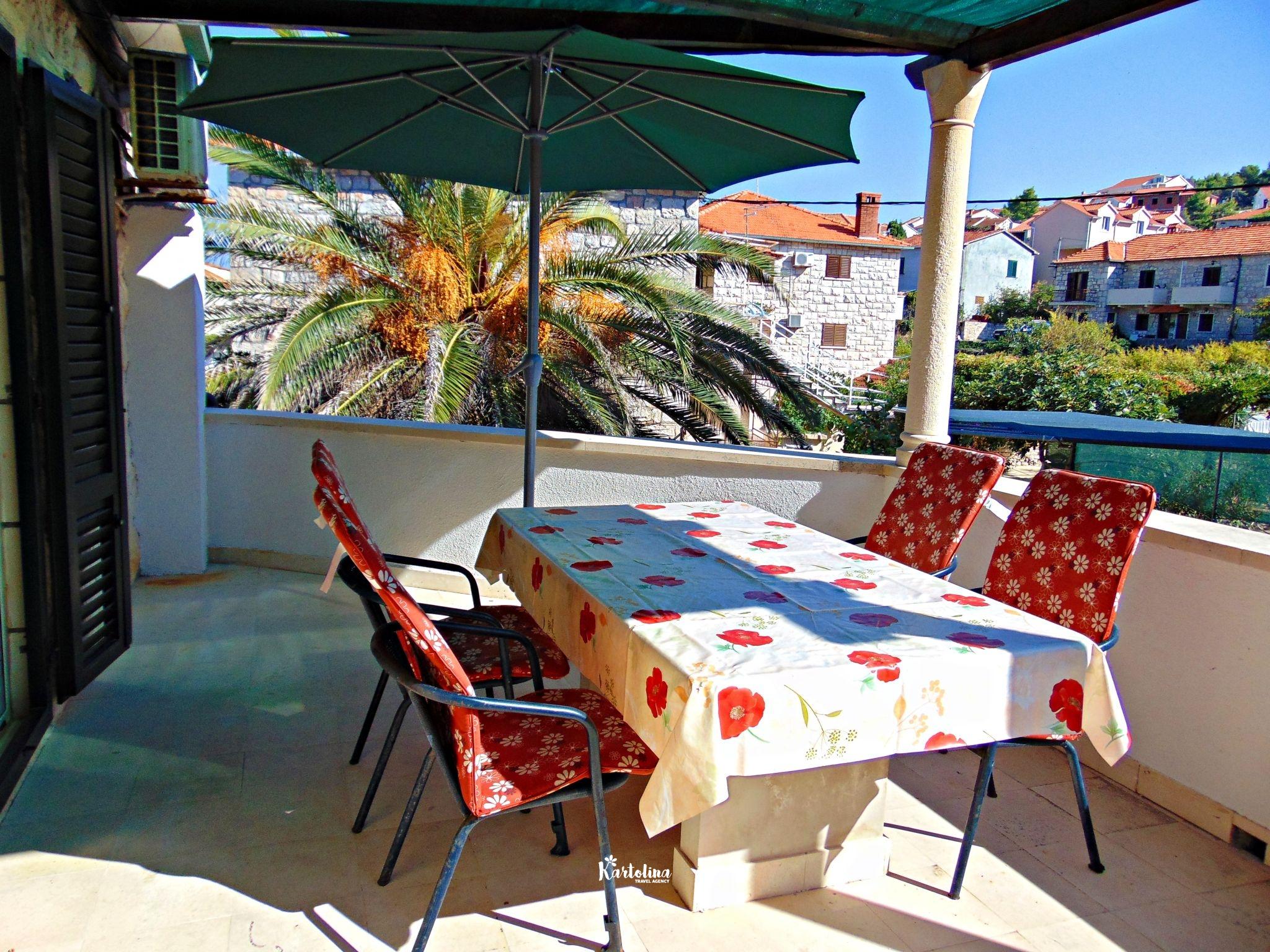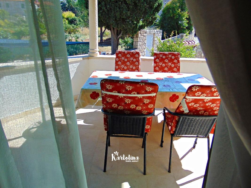Na terasi se nalaze stol i stolice gdje možete uživati u prekrasnom pogledu na brački kanal i more.
