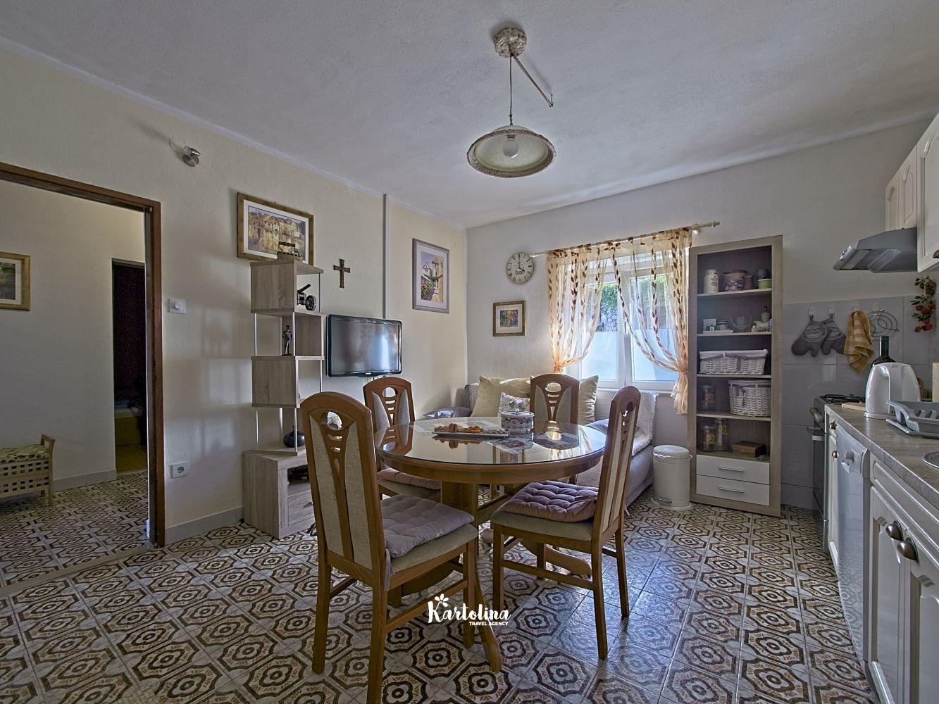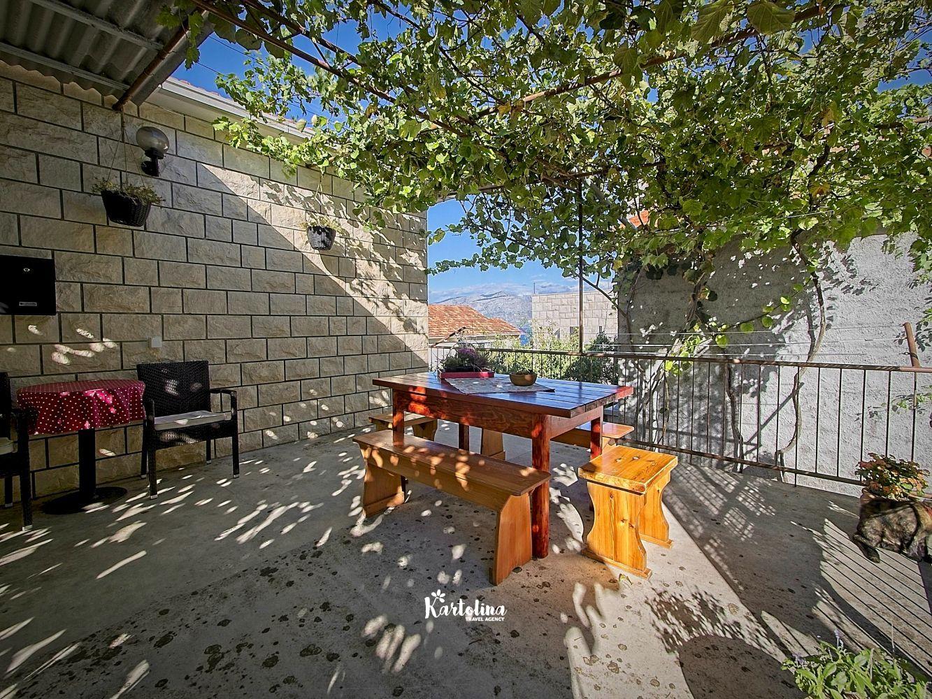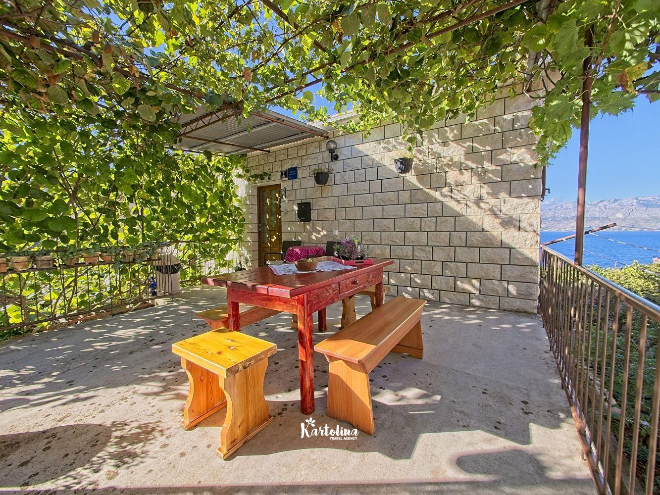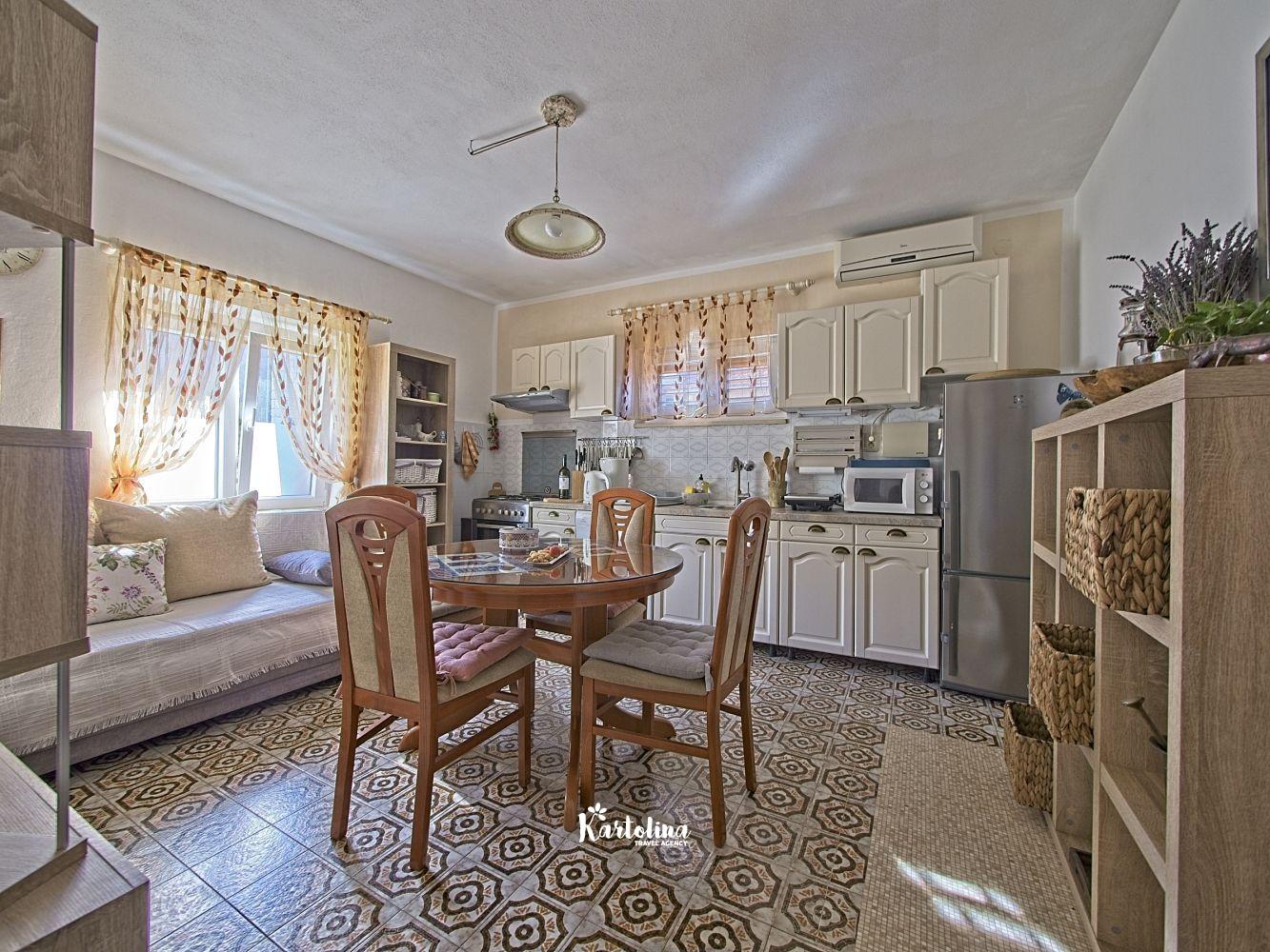 This cozy apartment has 3 bedrooms and it can accommodate 7 guests. When you enter it is actually located on the ground floor but from the terrace it seems like first floor. It has a great sea view and you can enjoy sitting in shadow. It is surrounded by garden and yard with open grill.