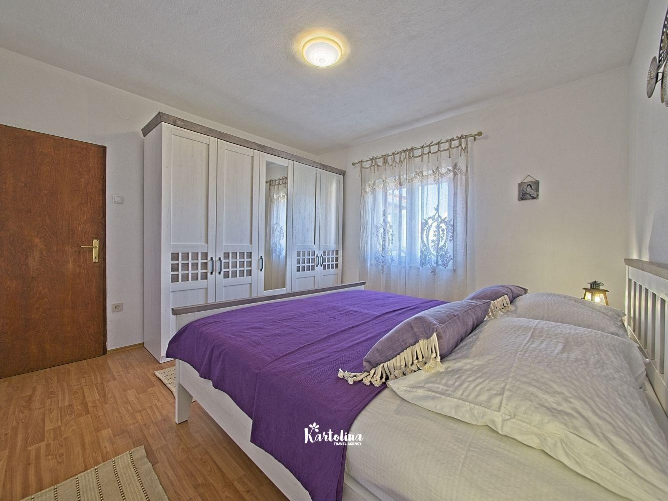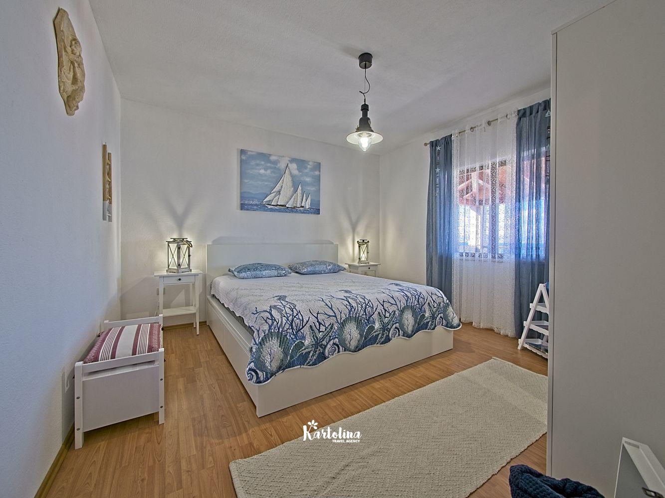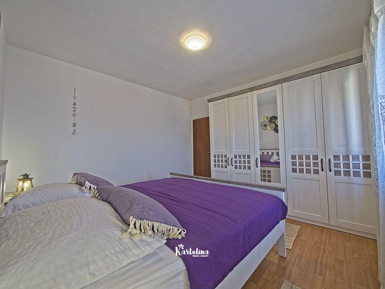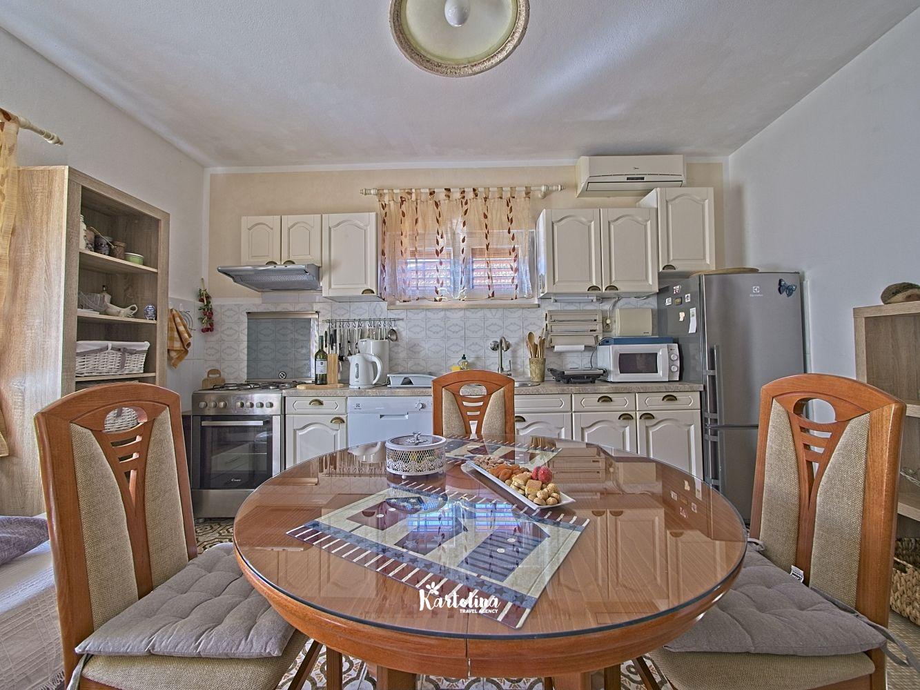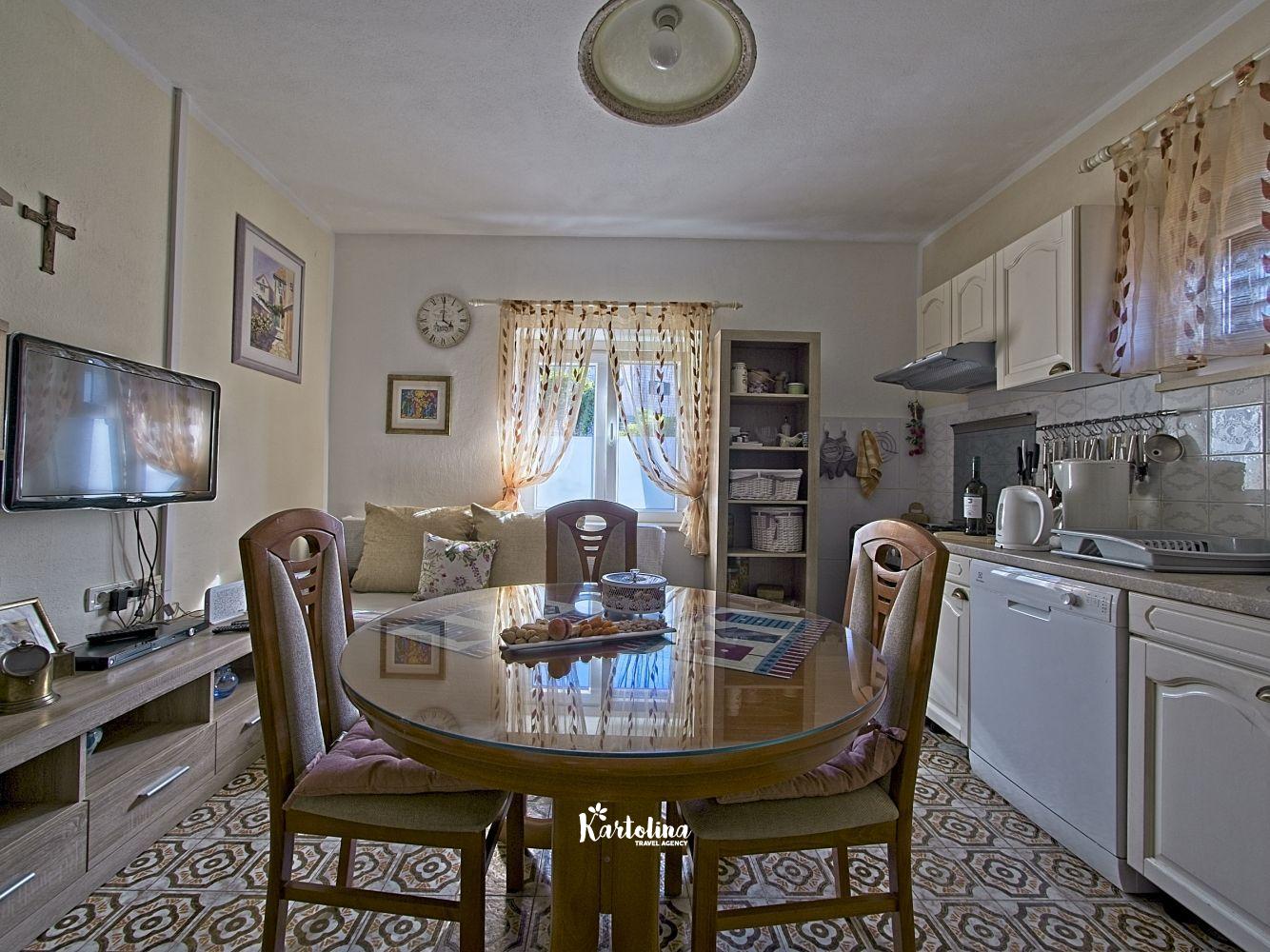 This cozy apartment has 3 bedrooms and it can accommodate 7 guests. When you enter it is actually located on the ground floor but from the terrace it seems like first floor. It has a great sea view and you can enjoy sitting in shadow. It is surrounded by garden and yard with open grill.