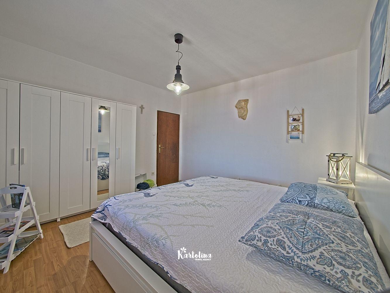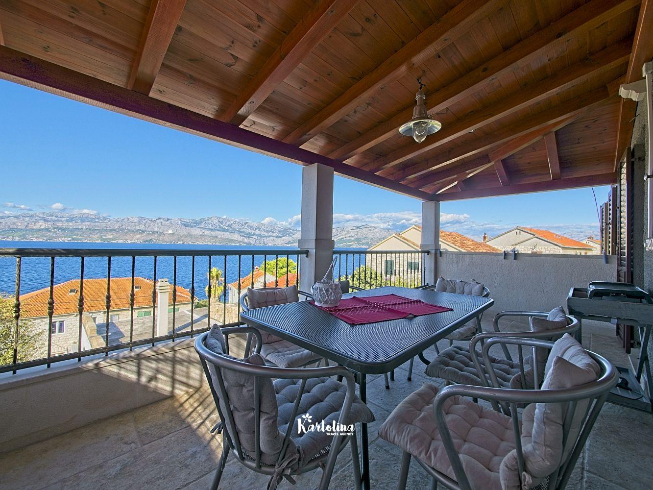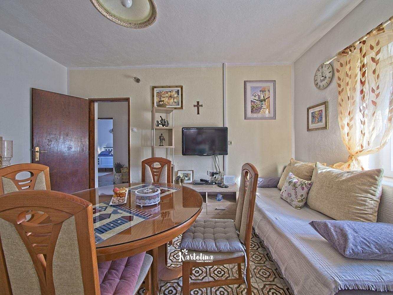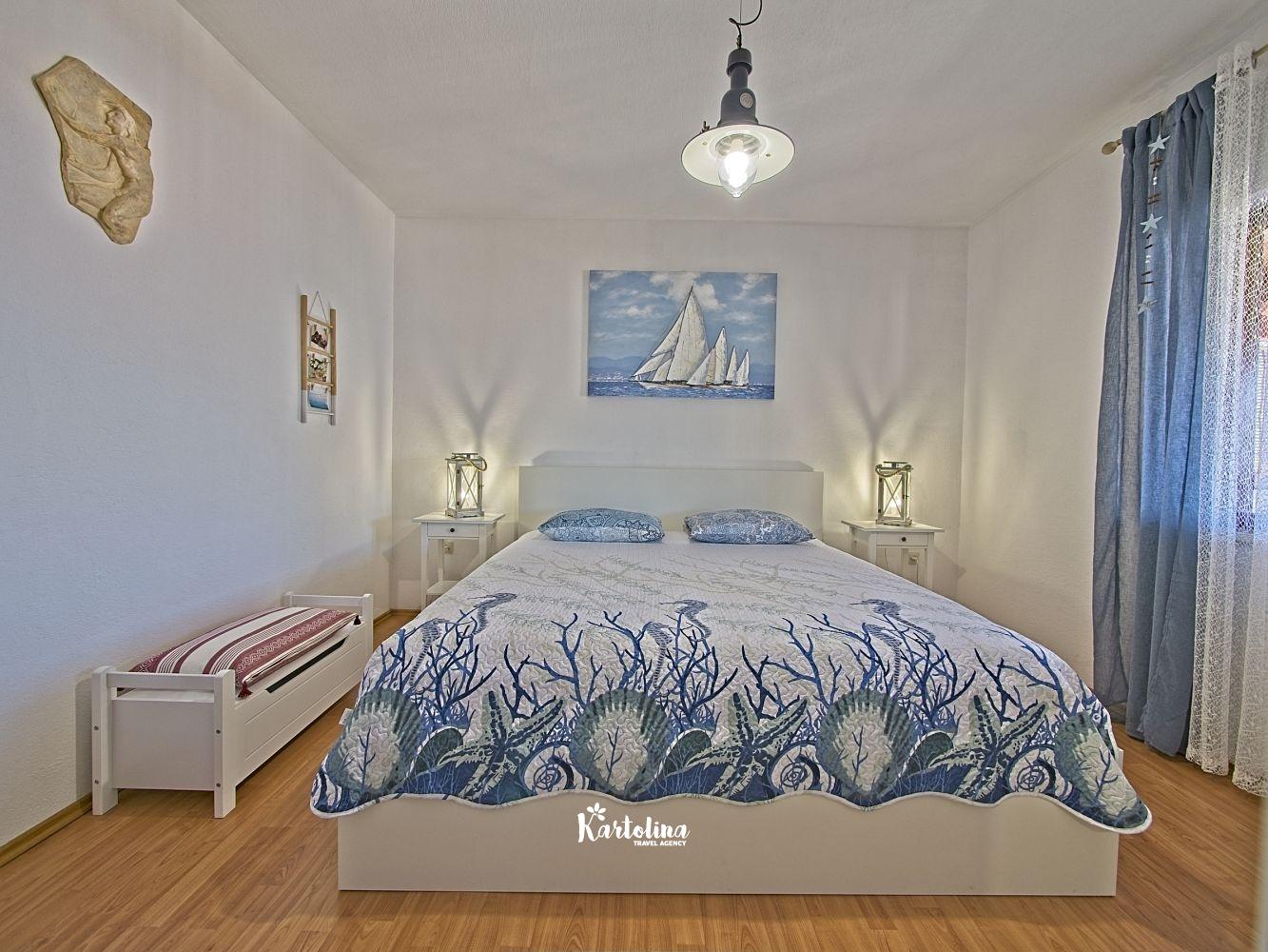 This cozy apartment has 3 bedrooms and it can accommodate 7 guests. When you enter it is actually located on the ground floor but from the terrace it seems like first floor. It has a great sea view and you can enjoy sitting in shadow. It is surrounded by garden and yard with open grill.