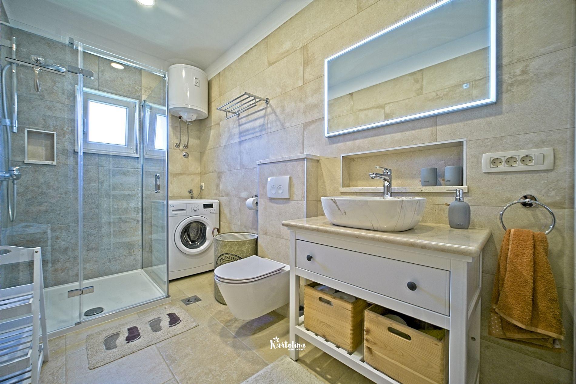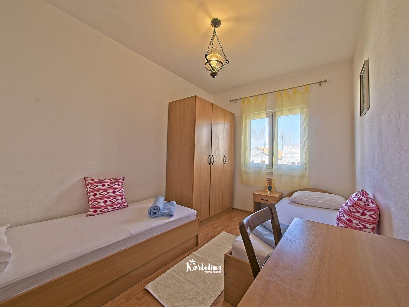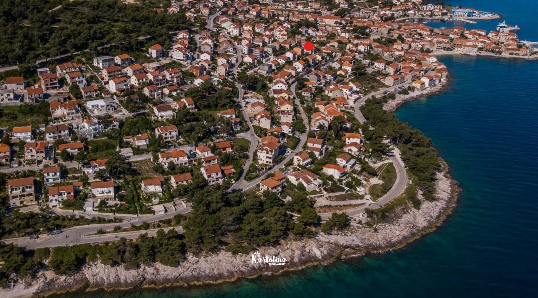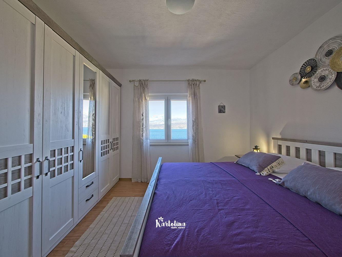 This cozy apartment has 3 bedrooms and it can accommodate 7 guests. When you enter it is actually located on the ground floor but from the terrace it seems like first floor. It has a great sea view and you can enjoy sitting in shadow. It is surrounded by garden and yard with open grill.