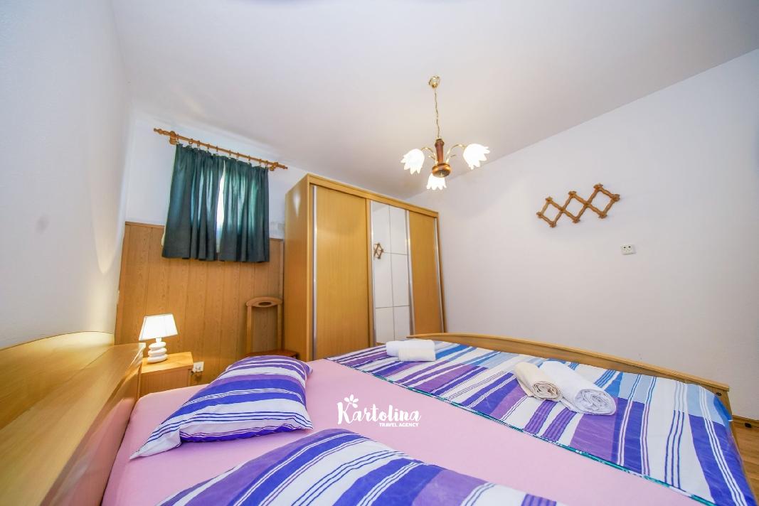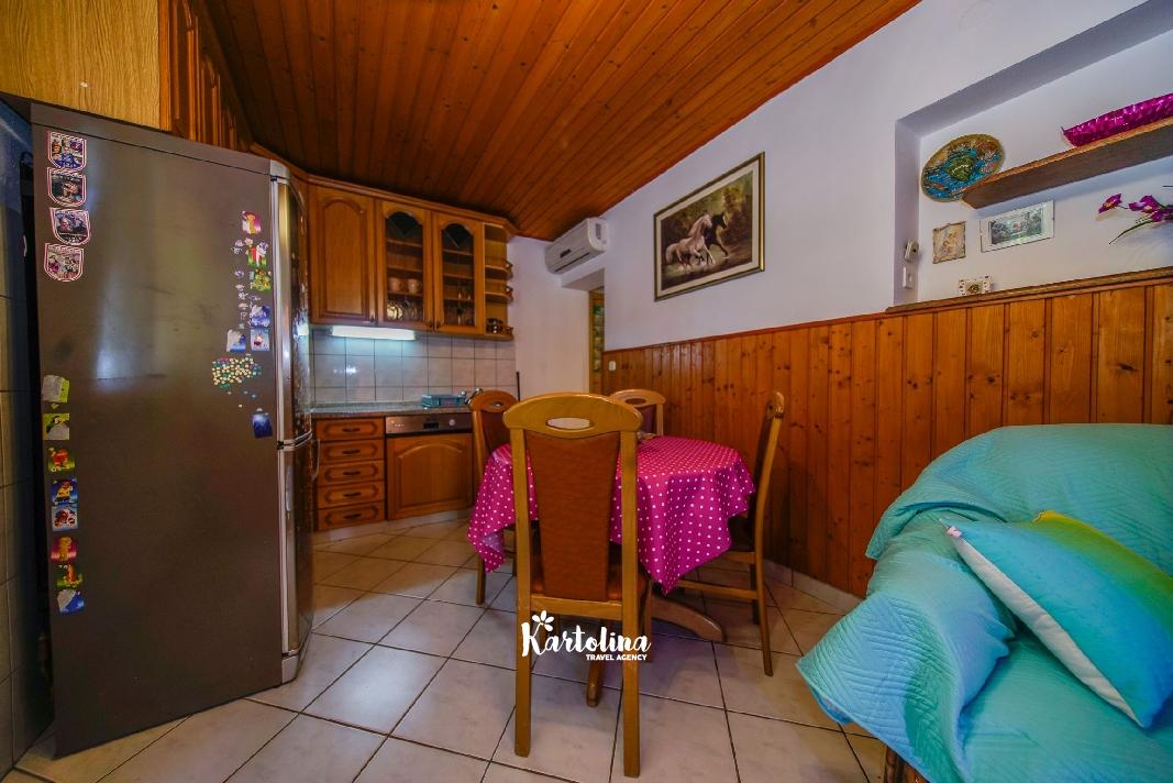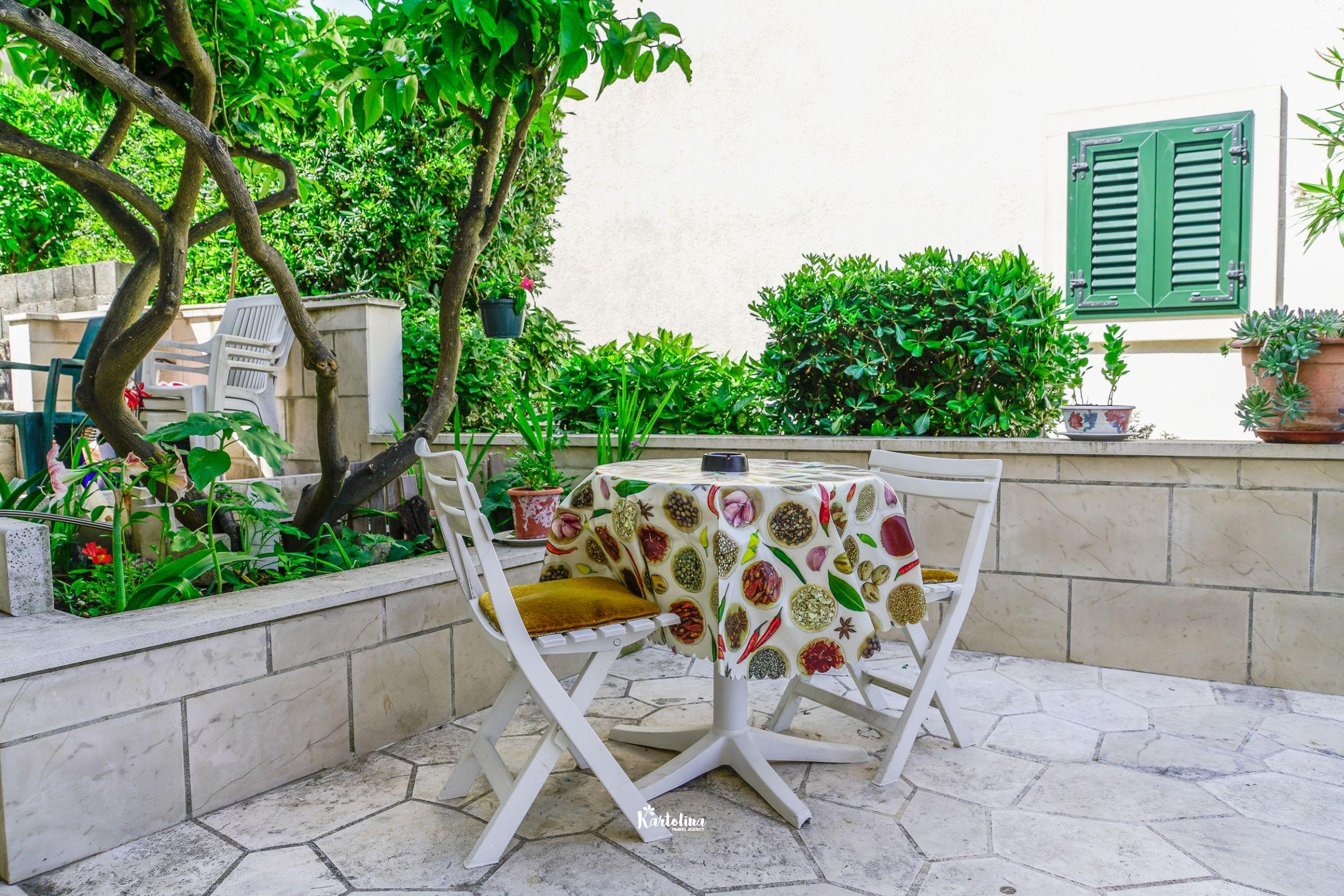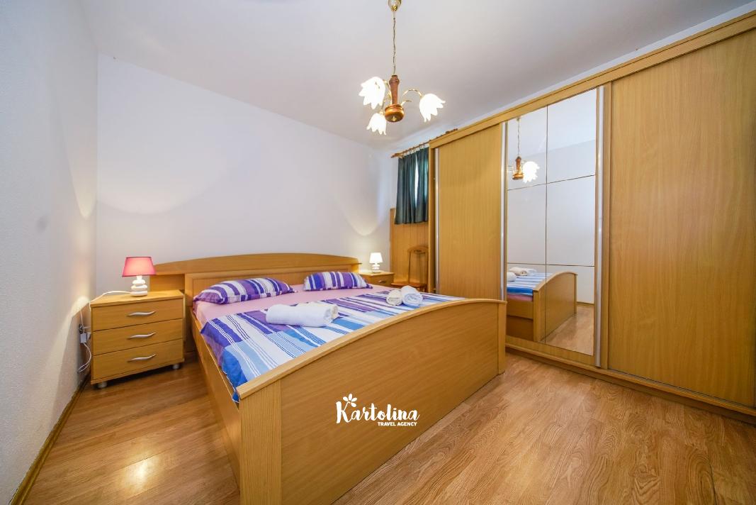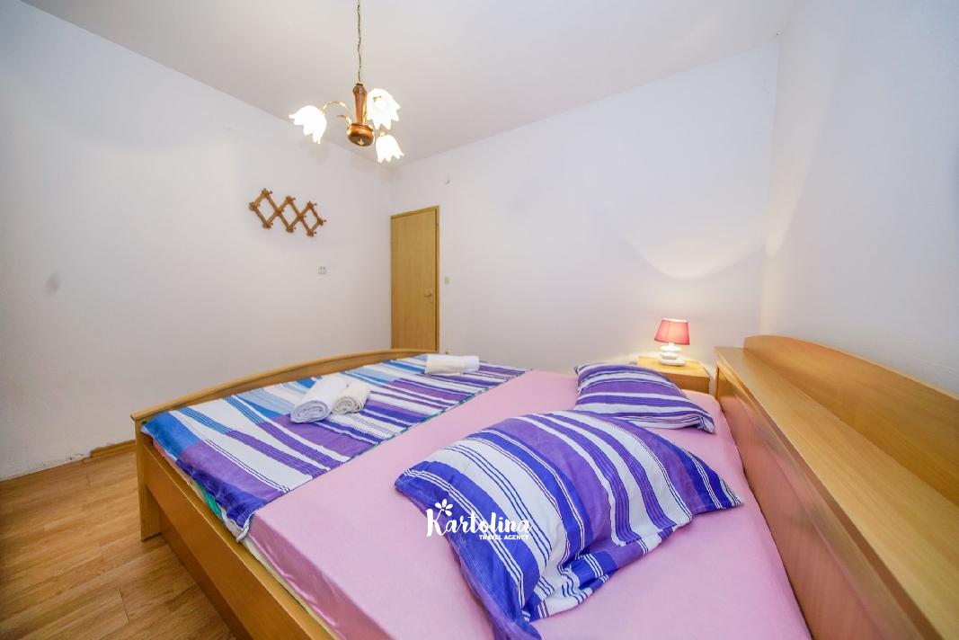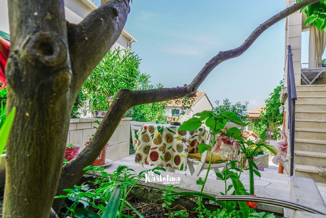 Apartman je smješten u prizemlju obiteljske kuće. Nalazi se u atraktivnom dijelu mjesta okružen vrtom i dvorištem. Centar je udaljen oko 500 m, najbliža šljunčana plaža oko 300 m.