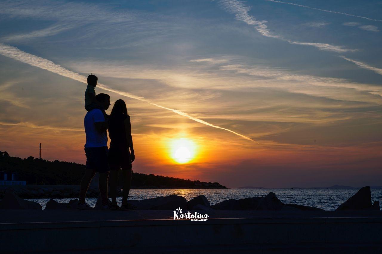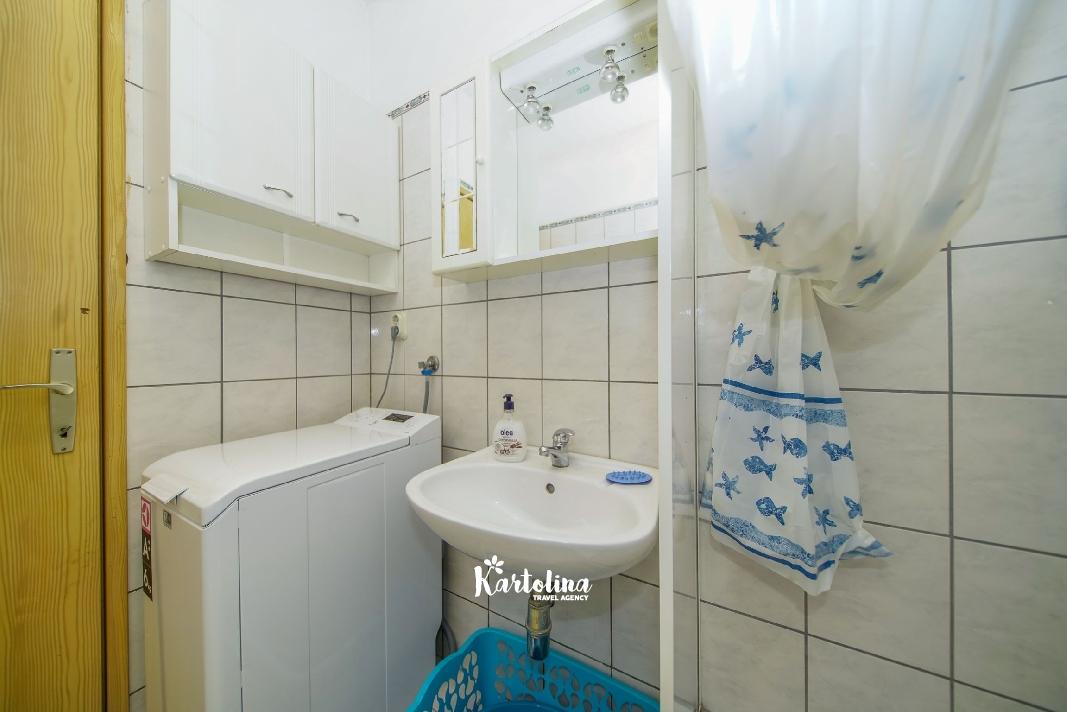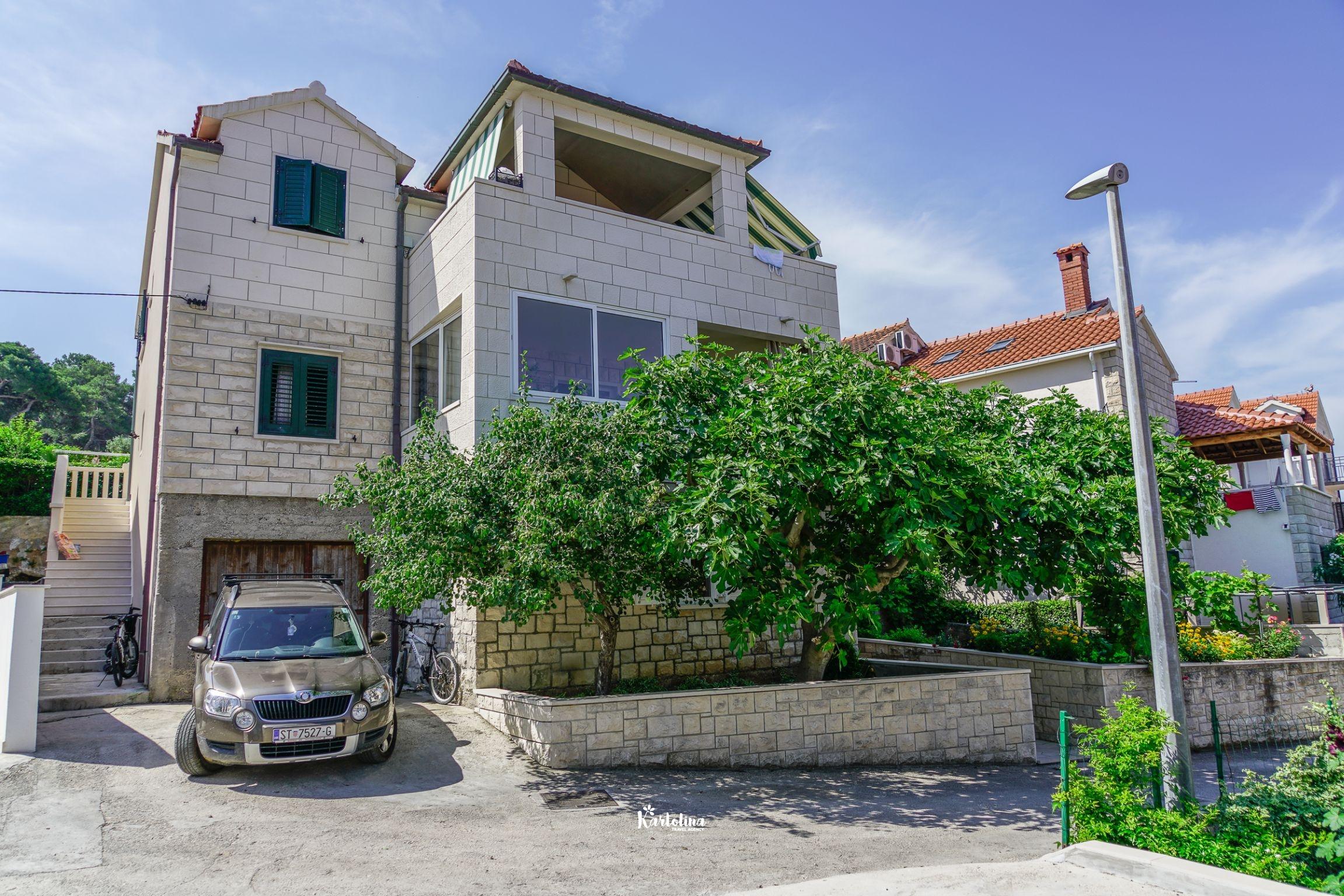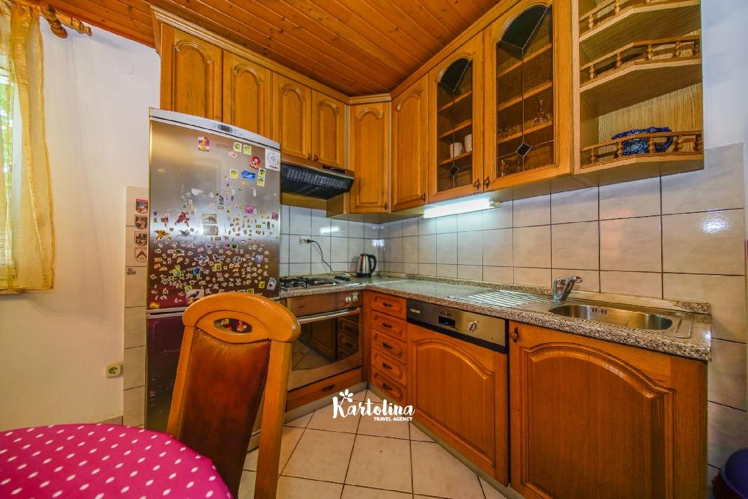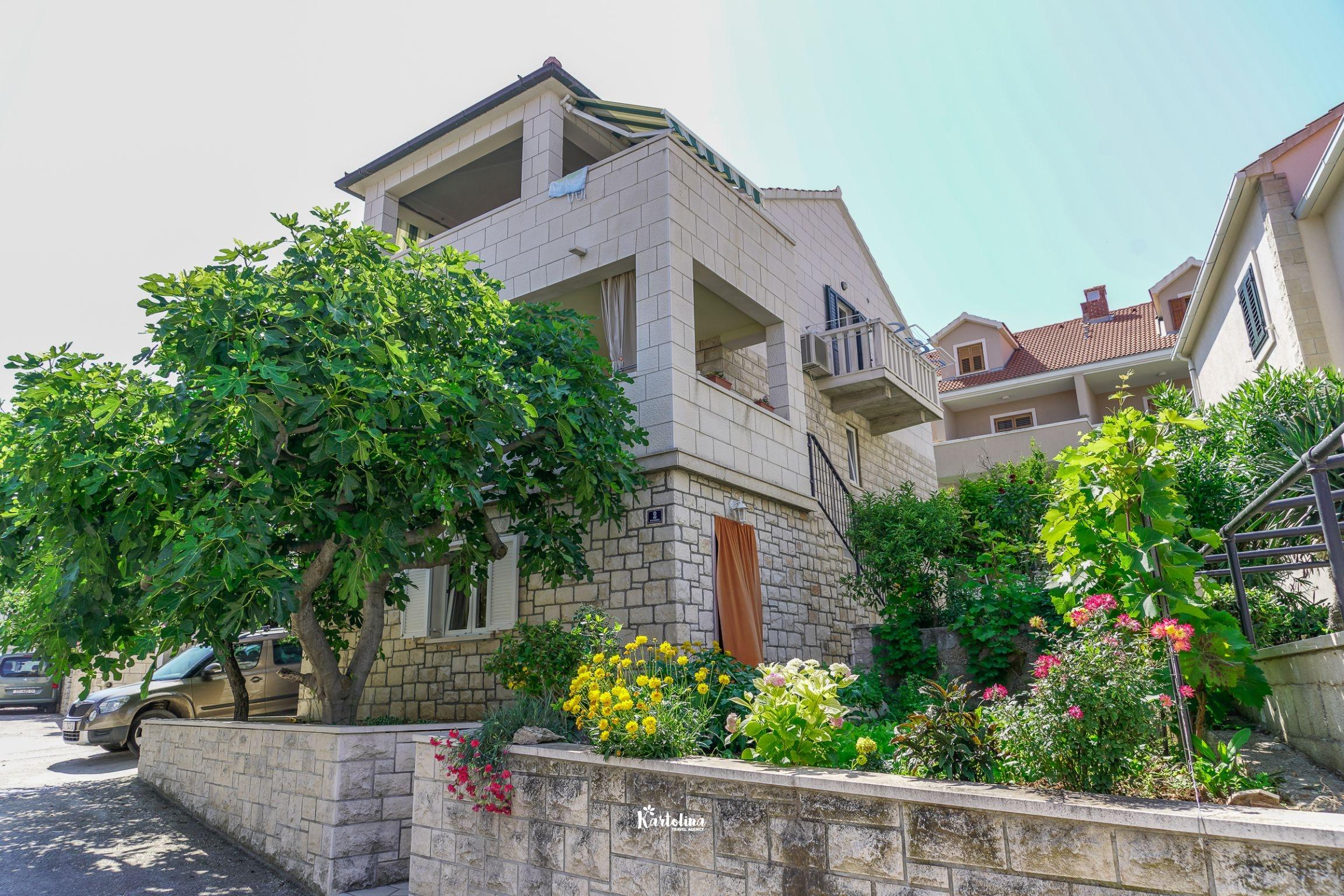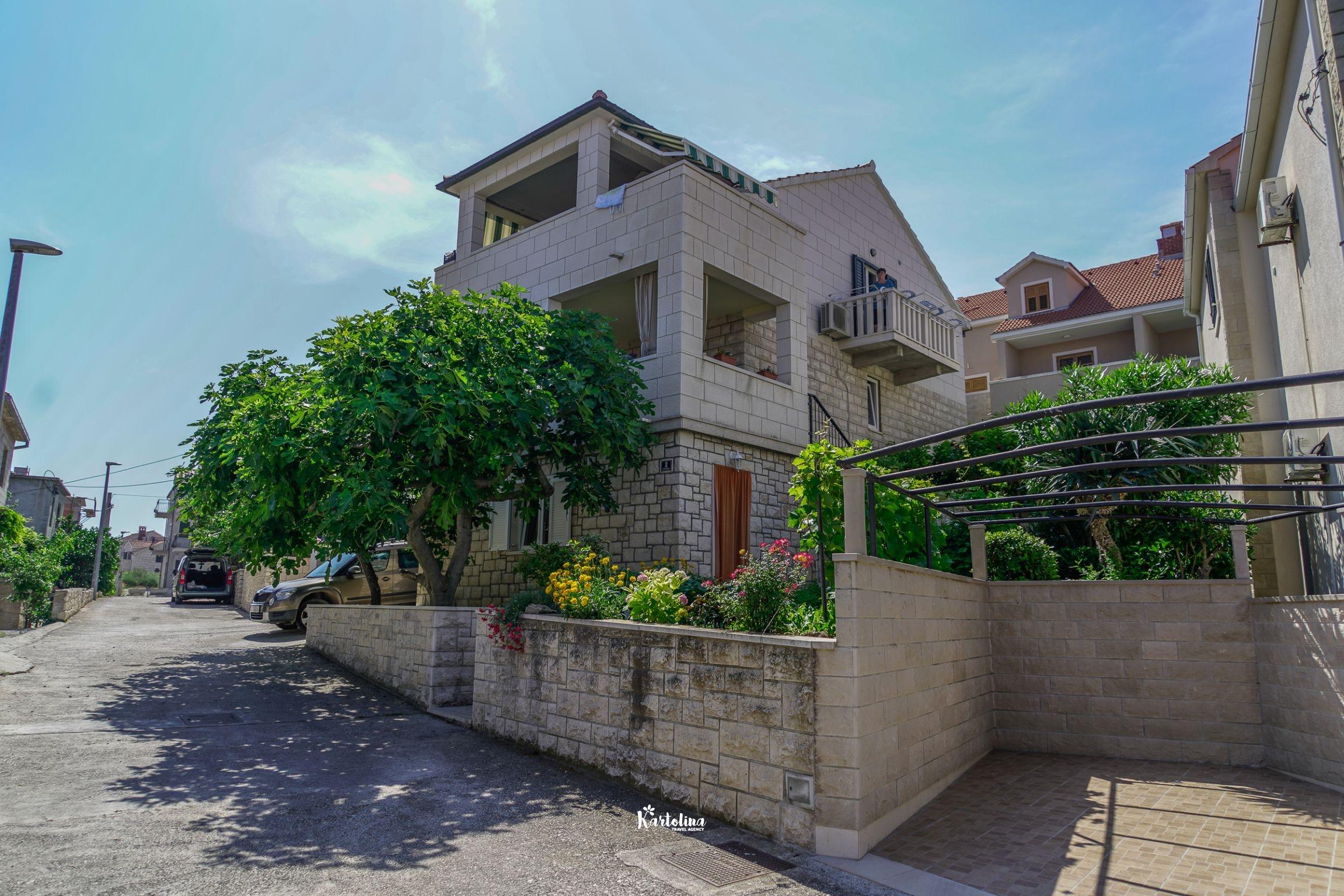 Apartman je smješten u prizemlju obiteljske kuće. Nalazi se u atraktivnom dijelu mjesta okružen vrtom i dvorištem. Centar je udaljen oko 500 m, najbliža šljunčana plaža oko 300 m.