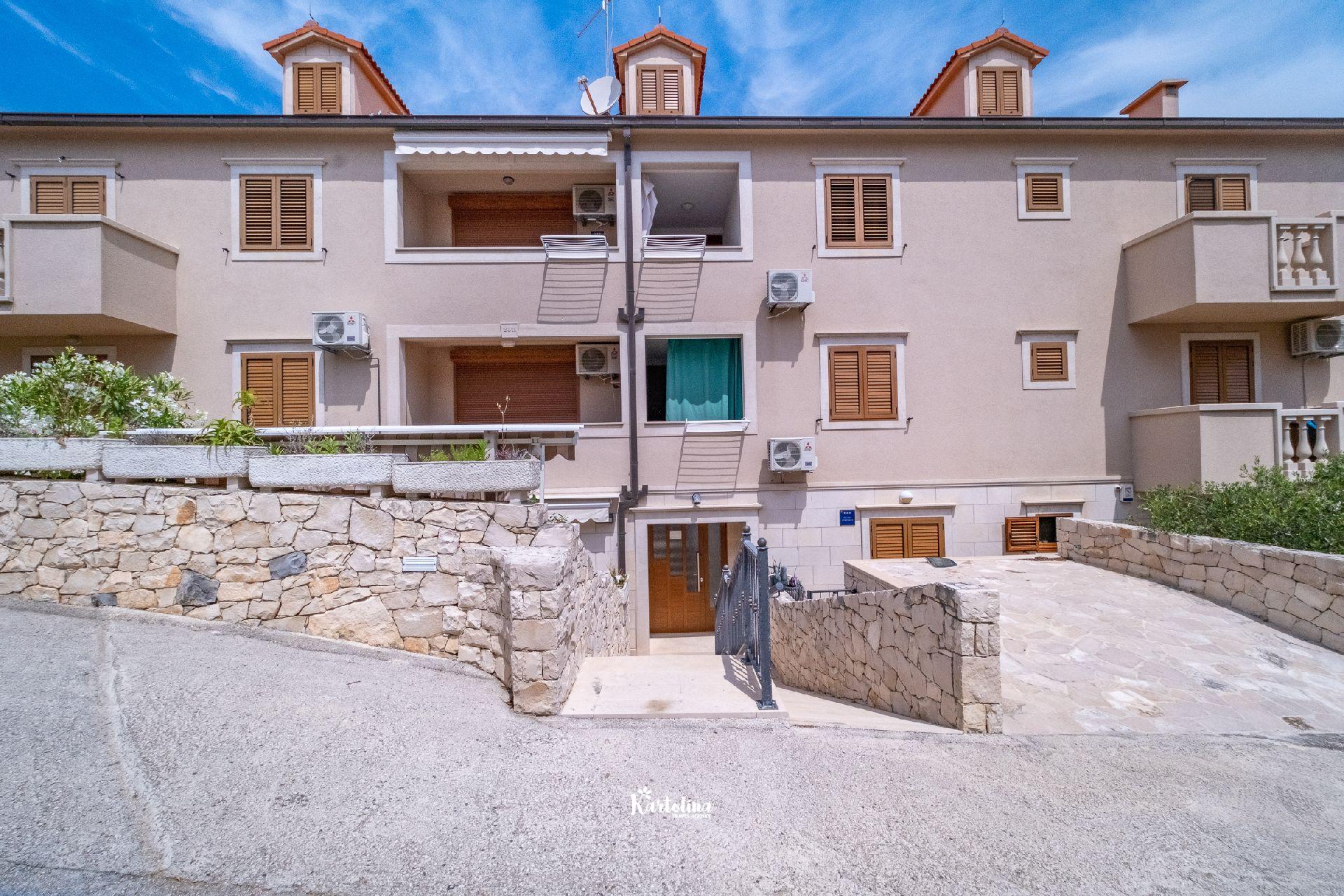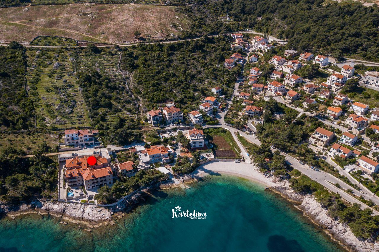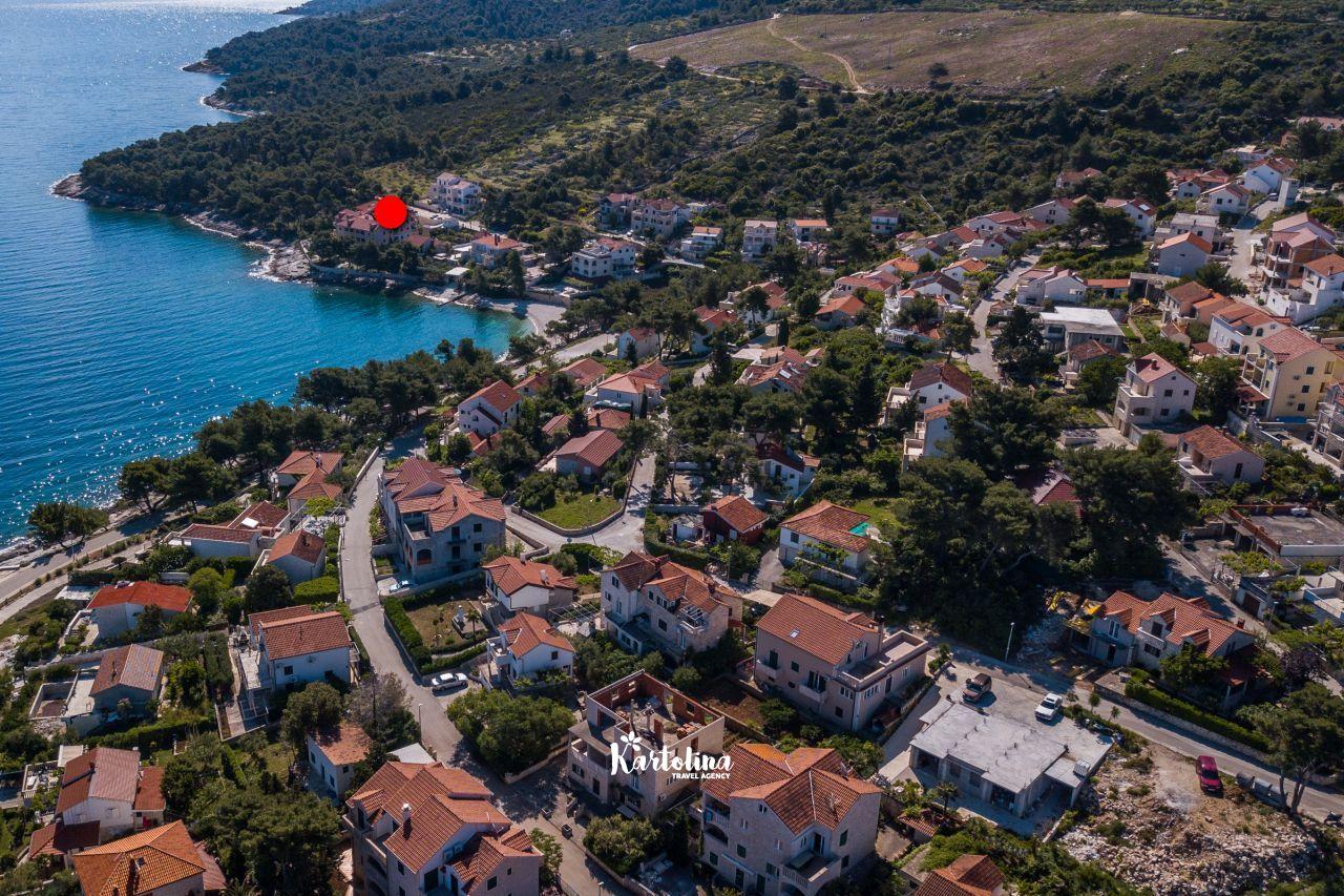 Apartman je smješten u mirnom predjelu na rubu mjesta u kući iznad stjenovite plaže. Iznad kuće nalazi se privatni parking. Centar mjesta udaljen je 1 km a najbliža šljunčana plaža oko 50 metara. U blizini se nalazi šetnica koja vodi do pješčane uvale Lovrečine. Kućni ljubimci su dobrodošli uz prethodni upit. Posteljina i ručnici uključeni su u cijenu smještaja.